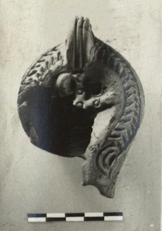 | Description: | Part of the front and top missing. Discus, Christian monogram, with impressed circle on the cross. Rim, herringbone; handle with double grooves above, single below; semi-pierced. Reverse, two concentric circles around the signature. Type XXVIII of Corinth collection. <graphic> | |