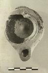 | Description: | The handle, about half the upper body, and chips from the nozzle missing. Flat bottom, rising slightly at the center. The body more angular, and the shoulder more marked than commonly in this type. Flat vertical handle, the lower attachment preserved. Around the central opening a substantial raised ridge. Flaky black to red glaze, all over; much worn. Type IV of Corinth collection, type 36 Variant of Agora collection. | |