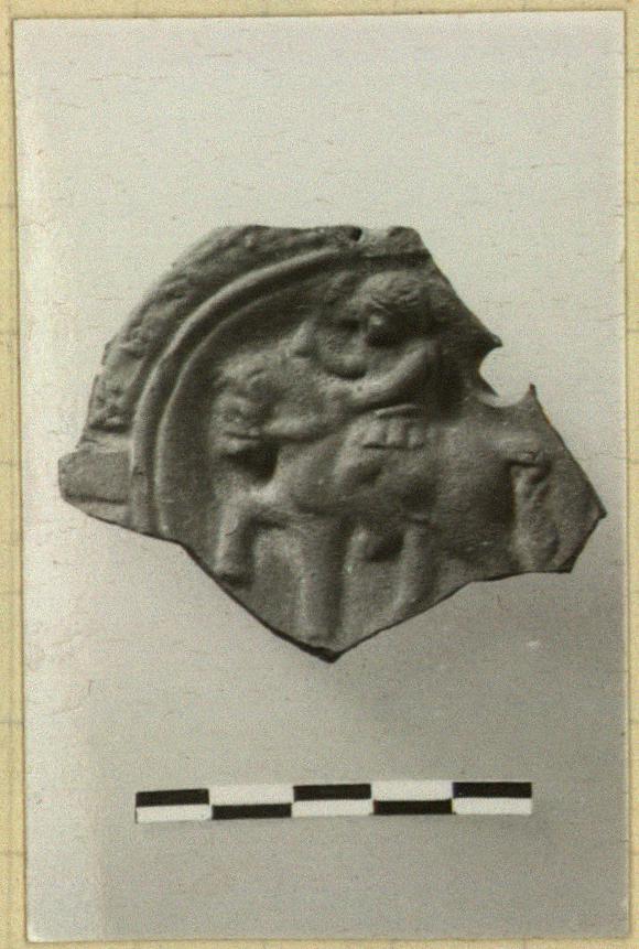 | Description: | Most of discus and part of rim preserved. Dotted band, panellled on rim; horse and rider, left, on discus. The rider wears a short garment, and holds something in his upraised right hand. Clay black from fire. Type XXVIII of Corinth collection. | |