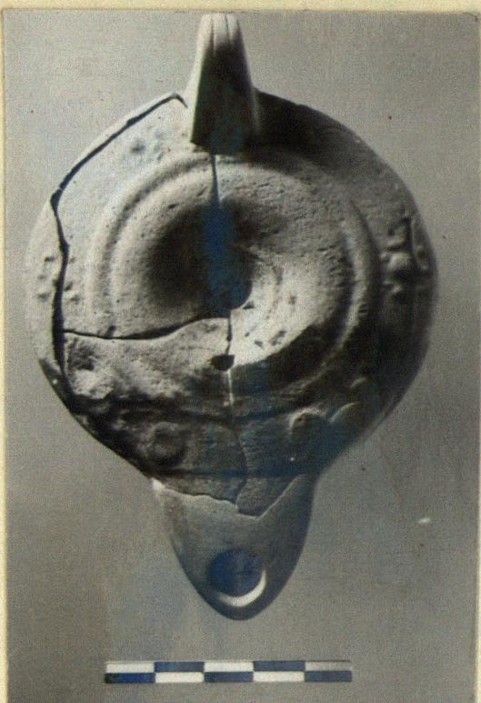| Description: | Nozzle, handle and piece of bottom missing, mended from many pieces. Semi-convex discus with nozzle slightly depressed from rim and two raised discs at base of nozzle on rim; dot rosettes on rim. Handle pierced. The front much burned, after breaking. Pale light buff clay. Type XXVII Variant of Corinth collection. Cf. B 17:1. | |