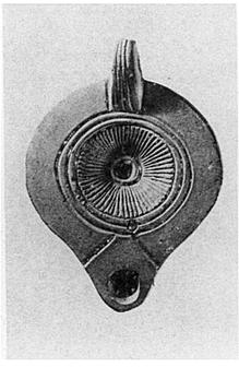 | Description: | Intact. Partially pierced handle; plain rim; rays on discus; nozzle set off by two grooves. Incised letters on bottom, with two circles. Transitional. No glaze. Thin red-buff clay. Type XXVII of Corinth collection. <graphic> | |