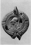 | Description: | Mended from many pieces; end of nozzle and part of bottom missing, and chips. Partially pierced handle; two rows of dots separated by ridge on rim; bust of Athena, Promachos type, left, in relief on discus. Five small incised circles on bottom, within a circul;ar groove. No glaze. Transitional. Orange-buff clay. Type XXVII of Corinth collection. | |