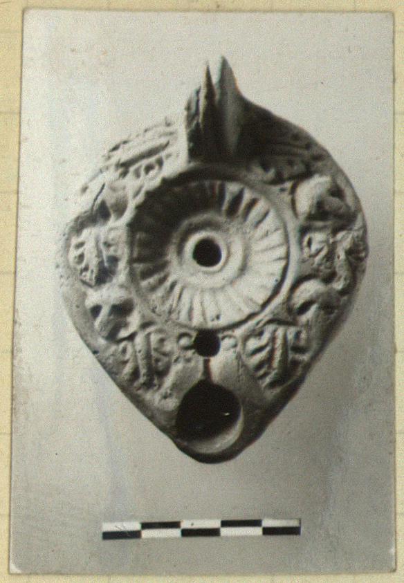 | Description: | Unpierced handle, double grooved above, single below. Rays on discus; vine leaves and clusters on rim. Reverse, five impressed circles within double concentric grooves. Purple-red glaze, worn. Light red clay. Type XXVIII of Corinth collection. | |