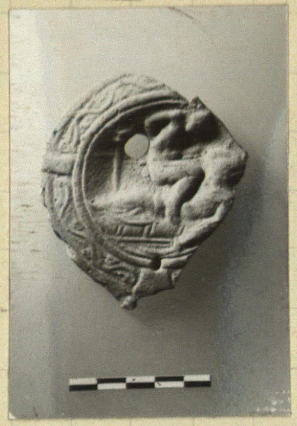 | Description: | Disc and part of rim. Rim, wavy tendril pattern, panelled; discus, erotic symplegma; lamp stand to left. Pale buff clay. Type XXVII of Corinth collection. | |