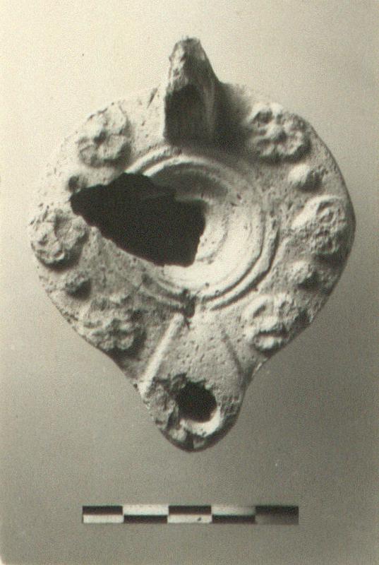 | Description: | Complete save minor chips; discus broken. Plain discus surrounded by two raised ridges. On the rim, rosettes, alternating with large dots. Handle grooved, pirced. Base ring. Light buff clay. Type XXVII of Corinth collection. | |