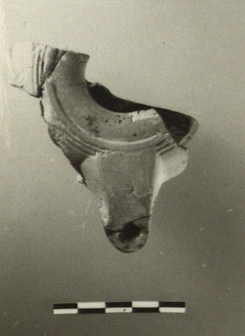 | Description: | Fragmentary; the profile nearly complete, with the nozzle and one end of the strap handle at the back. Very low raised base, lightly grooved beneath. Small narrow nozzle. On the wall outside the rim, three fine grooves. Black glaze inside only. Type VIIB of Corinth collection, type 24C' of Agora collection. | |