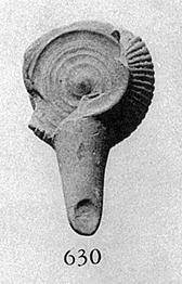 Rays on rim; long rounded nozzle, the wick-hole left unpierced. High base, concave beneath.
