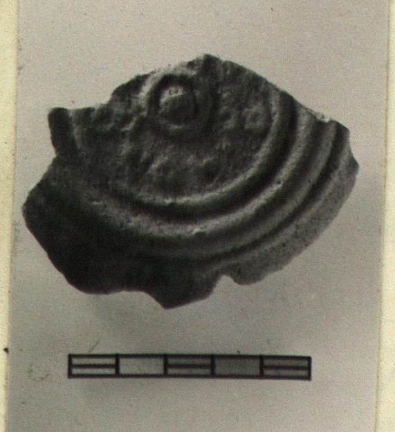 | Description: | About two thirds of the bottom preserved. Reverse, three raised ridges, the largest serving as ring foot. At center, raised circle and dot. Letters in relief around. Pale buff clay. Type XXVII Variant (?) of Corinth collection. Cf. L 710, L 4093. <graphic> | |