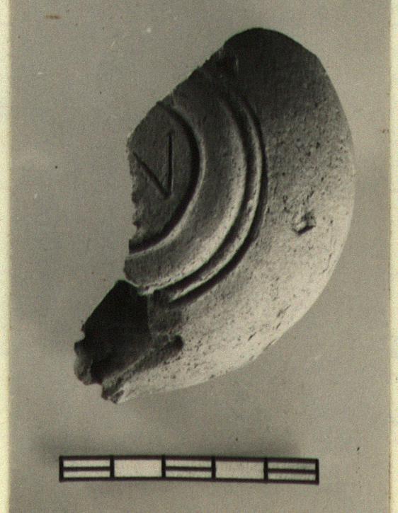 Description:   About one third preserved, with edge of sunken discus separated from narrow plain rim by two ridges. Rounded ridge as ring foot, with two grooves outside of it, one inside. Transitional.