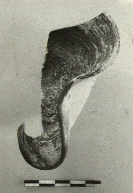 | Description: | Trefoil lamp with flat bottom; the nozzle (burned) and part of the side preserved. Dull black glaze inside (?). Pinkish-buff clay. Type 4 of Agora collection. ADDENDA Restored in plaster since photographing. | |