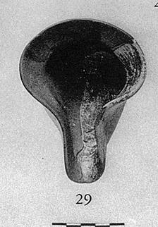 | Description: | Trefoil lamp with flat bottom; the nozzle (burned) and part of the side preserved. Dull black glaze inside (?). Pinkish-buff clay. Type 4 of Agora collection. ADDENDA Restored in plaster since photographing. | |
