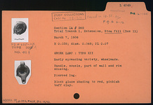| Description: | Early spreading variety, wheelmade. Handle, nozzle, part of wall and rim missing. Pierced lug. Black glaze shading to red, pinkish-buff clay. Type XII of Corinth collection, type 33A of Agora collection. ADDENDA EM: Found in 18-31. | |