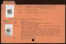 Description:   Fragment from discus and rim. Part of front and left side broken away.