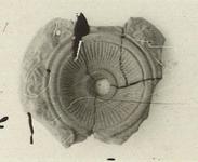 | Description: | Fragment from discus and rim. On rim, vine pattern. Discus, set off from rim by double groove; concave; narrow rays, with raised ring round central filling hole. Unglazed. Pale buff clay. Type XXVII of Corinth collection. | |