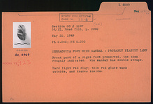| Description: | Front part of a right foot preserved, the toes roughly indicated. The sandal has double straps. Thin red glaze wash outside, and traces inside. Hard light red clay. | |