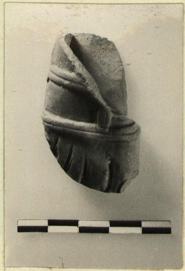 | Description: | Front part of a right foot preserved, the toes roughly indicated. The sandal has double straps. Thin red glaze wash outside, and traces inside. Hard light red clay. | |