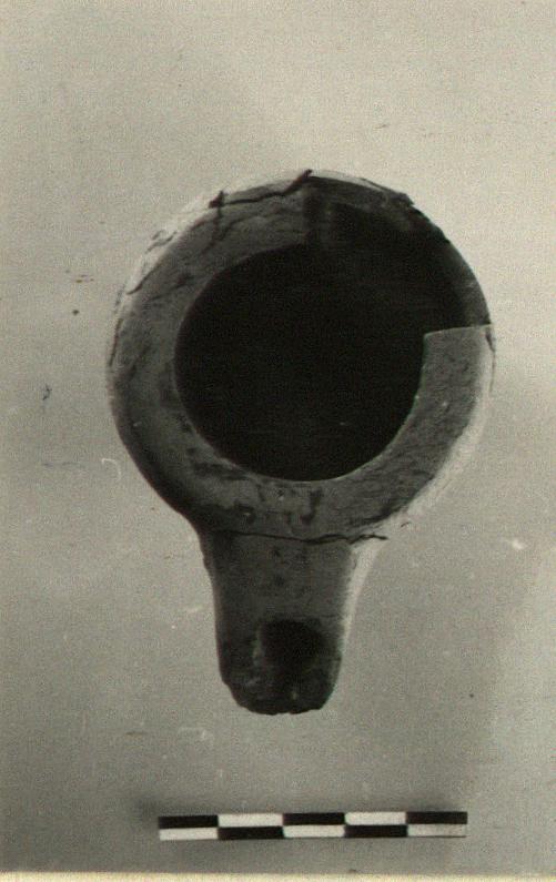 | Description: | Suspension lamp, with two nozzles, one of them missing; the suspension stem broken off, and part of the rim. Deep lamp on raised base; narrow rim flat on top. Outside unglazed; inside flaked, but perhaps was glazed red; trace of red drip on rim. "Poor relation"; between types 4 and 6. Flaky pinkish-buff clay. Type IV of Corinth collection, type 27 Variant of Agora collection. | |