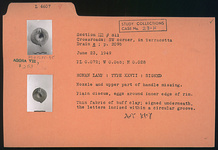 | Description: | Nozzle and upper part of handle missing. Plain discus, eggs aroynd inner edge of rim. Signed underneath, the letters incised within a circular groove. Thin fabric of buff clay. Type XXVII of Corinth collection. | |