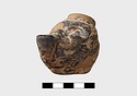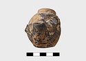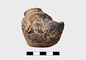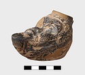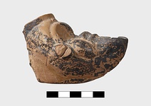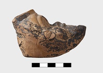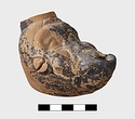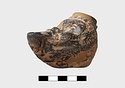 In form of grotesque head with mouth for nozzle. Large filling hole on top of head. Part of pierced lug on left side and points of attachment for handle at back.