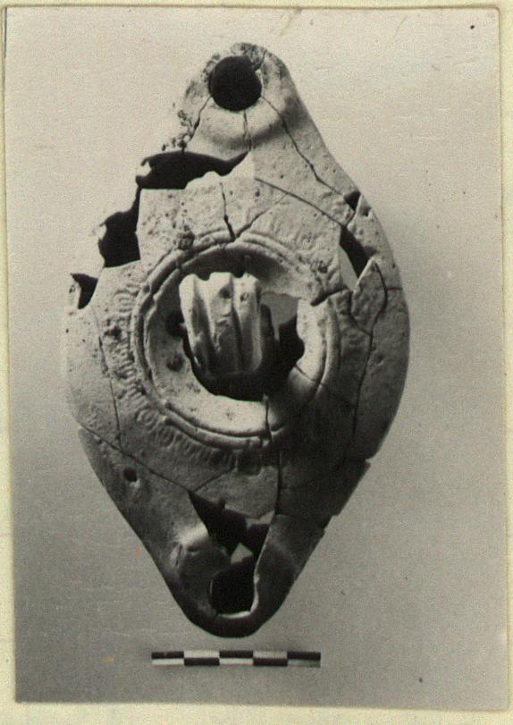 | Description: | Mended from many pieces, fragments missing. Boat-shaped lamp with two nozzles; handle set in center of discus. Stamped ovules around discus. Traces of incised signature on bottom. Traces of a band of light brown wash around top of sides, as if for fastening the two halves together. Light gray-buff fabric. Type XXVII of Corinth collection. ADDENDA Found with P 19823 (OO 831). | |