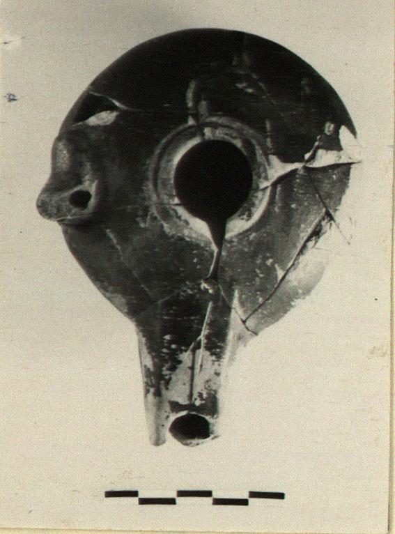 | Description: | Mended from many pieces; complete except for tip of nozzle and small chips. Ring base, groove around filling hole, large pierced lug at left side. Incised on upper face of nozzle. Black glazed over all. Grayish clay. Type IX of Corinth collection, type 42B of Agora collection. | |