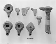 | Description: | Nozzle and part of rim and body preserved. On bridge of nozzle is a double palmette in relief. On rim are saryr masks in relief, with long square beards: Megarian bowl motif. Metallic black glaze, largely peeled on exterior. Type XII of Corinth collection, type 46D of Agora collection. | |