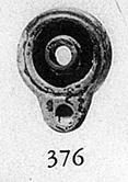 | Description: | Part of central tube broken, otherwise intact. Raised base; short nozzle flat on top; wide central opening. Groove on rim. Black glaze, much flaked. Type 27A of Agora collection. | |