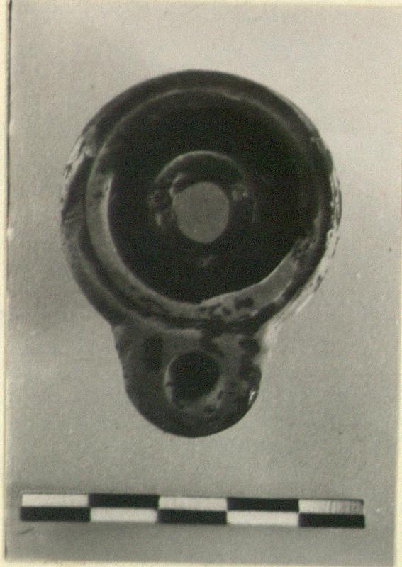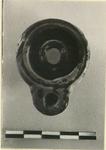 Raised base; short nozzle flat on top; wide central opening. Groove on rim.