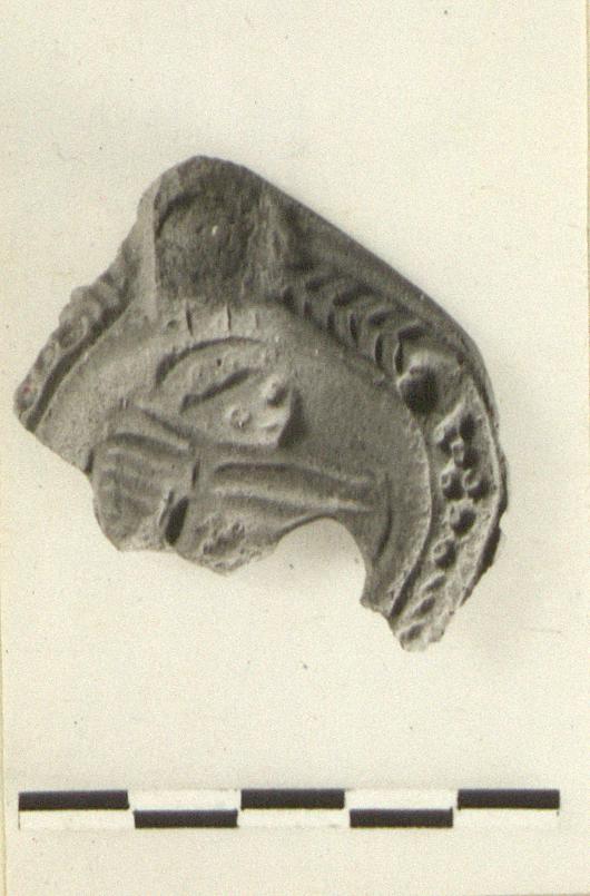 | Description: | Fragment from rim and discus; late variety, with down-sloping rim. Rim, herringbone; discus, winged figure. Unglazed. Light red clay. Type XXVIII of Corinth collection. | |