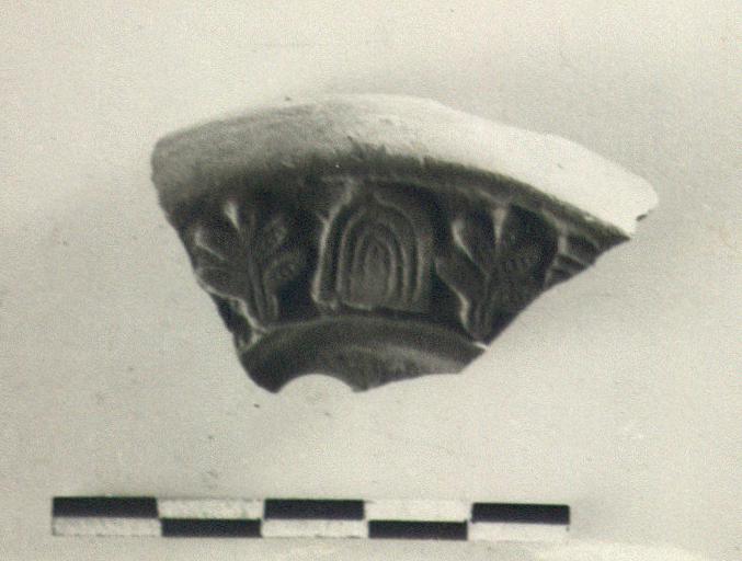 | Description: | Small fragment from rim, wall and discus. On the rim in relief, trees flanking an arch. Hard red clay. Type XXXI of Corinth collection. | |