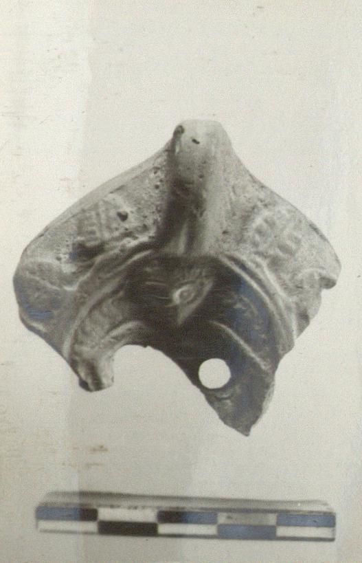 | Description: | About one third of back of lamp preserved. Unpierced handle. Two preserved holes on discus. Head, wings and arms of Eros, facing on discus. On underside, grooves spreading from base of handle. No glaze. Orange-buff clay. Type XXIX of Corinth collection. ADDENDA Sherds from same fill stored in Tin 156. | |