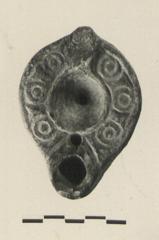 | Description: | Knob handle missing; otherwise intact. Discus plain; rim, raised circles between panels. Reverse, palm branch within almond-shaped grooves. The surface burned or stained a hard dark brown. Type XXVIII of Corinth collection. | |