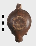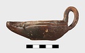 Discus, large and concave, decorated with ivy branches and, at the nozzle, a small jug. Rim, grooves. Nozzle with volutes. Handle plain, high swung.