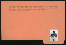| Description: | Four non-joining fragments of a large black glazed lamp. Plain discus; tongues on rim; ring base; band handle slightly concave above. On the bottom signature in relief letters. Fragmentary. Glazed all over outside and partly inside. Glaze somewhat metallic. Type XVIII of Corinth collection, type 52C of Agora collection. ADDENDA Joining fragments added from sherds; about half of top part, part of back, with attachments for handle, and end of nozzle missing. The handle fragment does not join. H. 0.058; W. 0.12; P.L. 0.148. | |