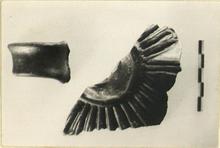 | Description: | Four non-joining fragments of a large black glazed lamp. Plain discus; tongues on rim; ring base; band handle slightly concave above. On the bottom signature in relief letters. Fragmentary. Glazed all over outside and partly inside. Glaze somewhat metallic. Type XVIII of Corinth collection, type 52C of Agora collection. ADDENDA Joining fragments added from sherds; about half of top part, part of back, with attachments for handle, and end of nozzle missing. The handle fragment does not join. H. 0.058; W. 0.12; P.L. 0.148. | |