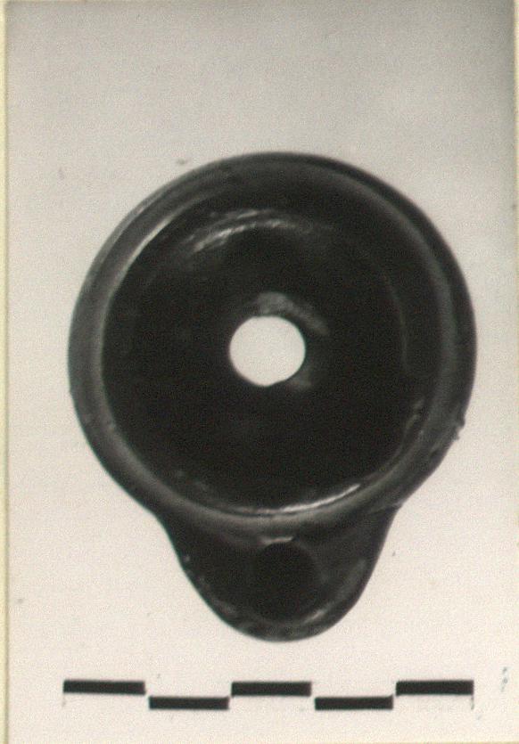| Description: | Most of central tube and disk missing; foot chipped. Scraped reddened groove on rim. Inside glazed. Flaky unevenly fired black glaze. Resting surface reserved. Type VII of Corinth collection, type 27A of Agora collection. | |