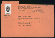 | Description: | Small fragment missing from middle of discus. Raised dots on discus and rim; low unpierced handle. Unglazed. Buff clay. Latest Roman. | |