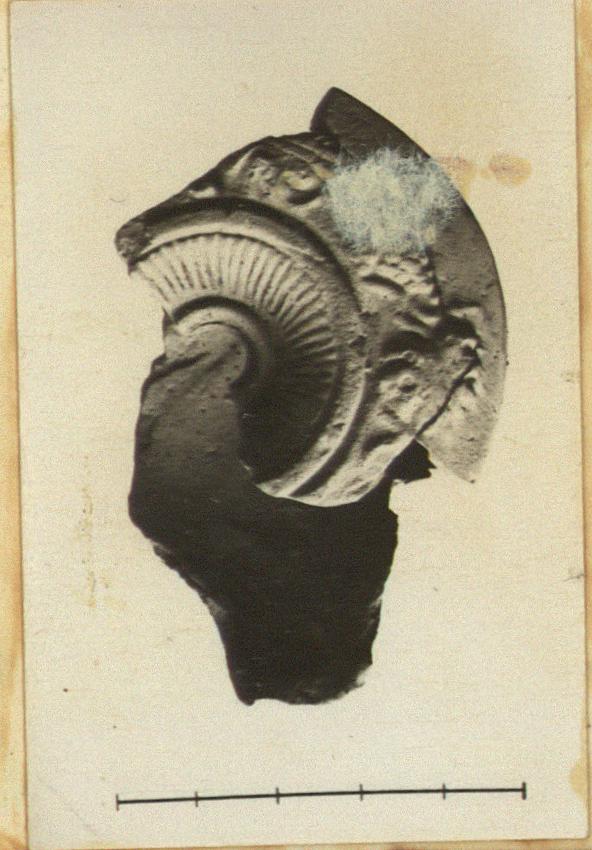 | Description: | Mended from two pieces. One quarter preserved giving profile but handle and nozzle missing. Rays and grooves on discus, grapes and vine leaves on rim. On bottom, leaf and signature in relief, within grooved circle. Unglazed. Buff clay. Type XXVII of Corinth collection. Cf. L 4801 (Z 1797). <graphic> | |