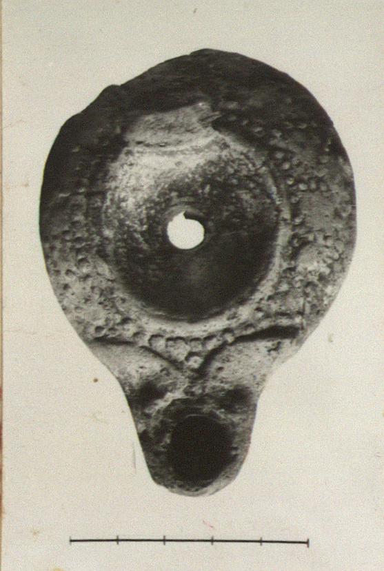 | Description: | Upper half preserved, handle missing. Dots on rim applied in pattern, outlining triangular shaped leaves. Poor black glaze, much rubbed. Reddish-buff clay. Type XX of Corinth collection. | |