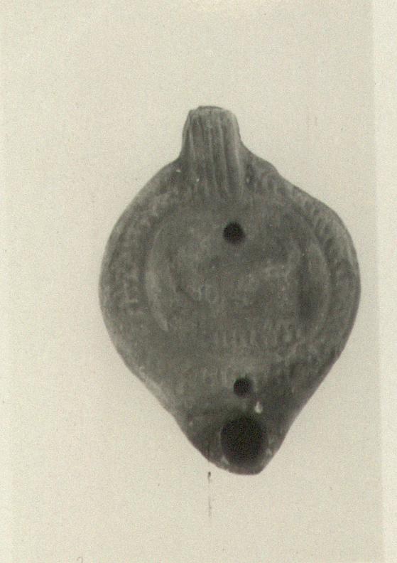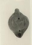 | Description: | On rim, herringbone. On discus, spotted collared dog left; filling hole above back between head turned back and tail turned forward. Nozzle set off by transverse groove with air hole in middle. Handle solid, triple grooved above, double below; set off by grooves from body. On bottom, within double circular groove: "A". Unglazed. Soft red clay. Type XXVIII of Corinth collection. | |