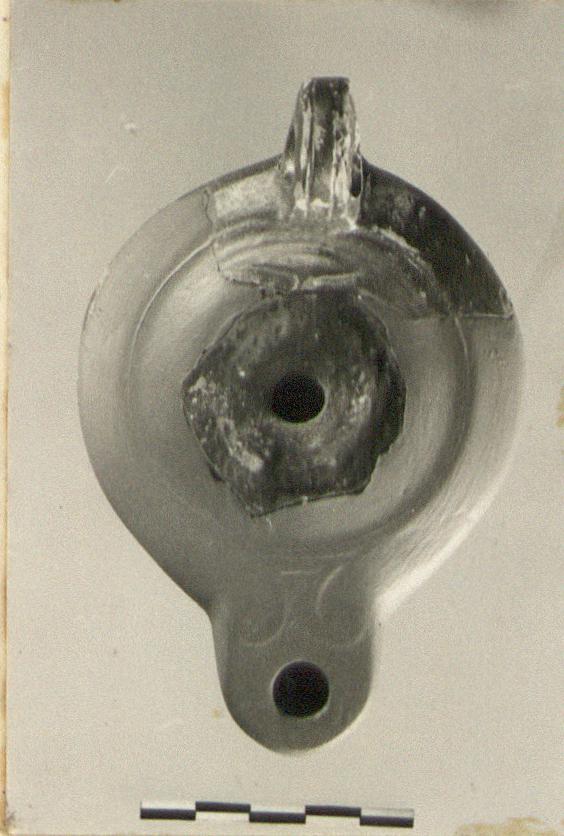 | Description: | Three joining fragments preserve most of discus, handle and part of base. Partly restored in plaster. Rim plain and narrow, set off from discus by three grooves. Discus decorated with wreath. Base plain. Pierced handle with two grooves on upper half. Good purplish-brown glaze with metallic lustre. Buff clay. Type XXIV of Corinth collection. | |
