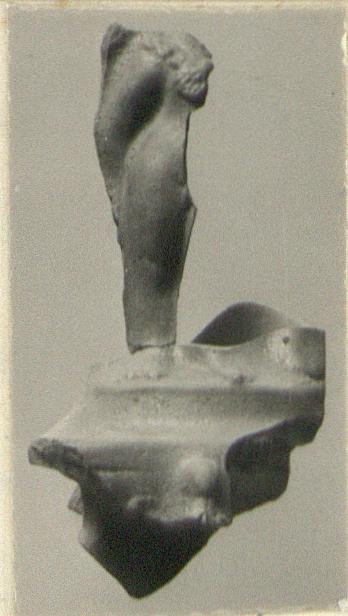 | Description: | Nine joining and non-joining fragments. On a cubical base, the front of which was adorned with figures in relief, the tip of a cap of Attis (?) is all that remains, stands a nude figure of Eros (?) of which only the lower right side of the body is preserved. Several fragments seem to represent bits of a rocky landscape, perhaps a background against which the figure leaned. Since one fragment, which must represent the bottom edge of the base shows that there was no bottom to the base, it is uncertain in what part of the lamp-figure was attached the nozzle. The nozzle fragment preserved is rounded at the tip and had volutes at the sides. Reddish-brown glaze with metallic lustre. Brownish clay. Cf. L 708. Cf. BMC Lamps, no. 409. | |