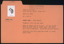 | Description: | Fragment from top and back. Bear at honey pot on discus. On rim narrow herringbone band at inner edge, the outer part plain panelled. Upierced grooved handle. Purplish-brown to black glaze wash. Brownish clay. Type XXVIII of Corinth collection. | |