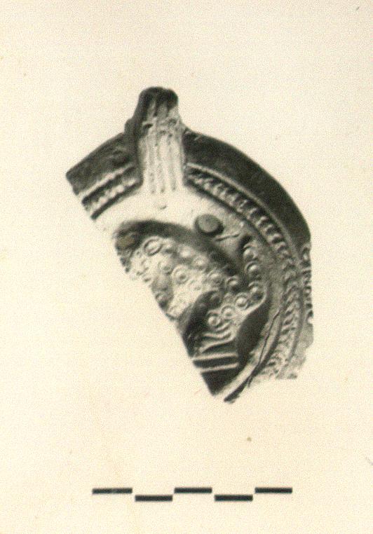 | Description: | Fragment from top and back. Bear at honey pot on discus. On rim narrow herringbone band at inner edge, the outer part plain panelled. Upierced grooved handle. Purplish-brown to black glaze wash. Brownish clay. Type XXVIII of Corinth collection. | |