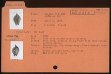 | Description: | Top part of lamp preserved. Tip of nozzle broken away. Rim sunk, with raised spiral pattern. On discus, palm tree, with filling hole on either side with raised spirals below. Projecting nozzle set off by broad channel from discus. On handle narrow, pointed knob, ungrooved. Red wash. Red clay. Type XXXI of Corinth collection. | |