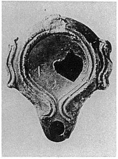 | Description: | Ring handle missing, chip out of discus; nozzle much burnt. Plain discus. Grooves on rim run out to nozzle as volutes. On each side a wavy band attached as a lug. On base, signature: raised "alpha". Thin dark red to brown glaze. Buff clay. Type XXIV of Corinth collection. | |