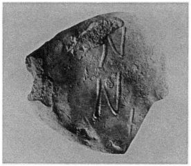 | Description: | Preserves about one third of mold for lower part of lamp. On outside, incised letters. Thick pale buff clay. Type XXVIII (?) of Corinth collection. | |