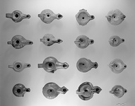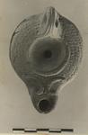 | Description: | Intact, but cracked. Dots on body of lamp not continuous; set in vertical panels. Double-grooved handle made in mould. Signature in relief on bottom. Traces of red glaze. Orange-buff micaceous clay. Type XX variant of Corinth collection. <graphic> | |