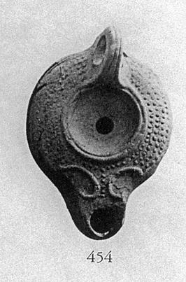 | Description: | Intact, but cracked. Dots on body of lamp not continuous; set in vertical panels. Double-grooved handle made in mould. Signature in relief on bottom. Traces of red glaze. Orange-buff micaceous clay. Type XX variant of Corinth collection. <graphic> | |