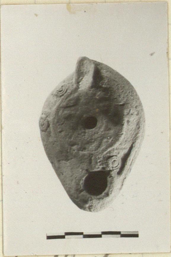 | Description: | Complete. Round discus with six-pointed star. Rim down sloping, decorated with raised concentric circles. Plain knob handle; underside slightly concave. No glaze; much worn. Orange-red clay. Type XXVIII (late variety) of Corinth collection. | |